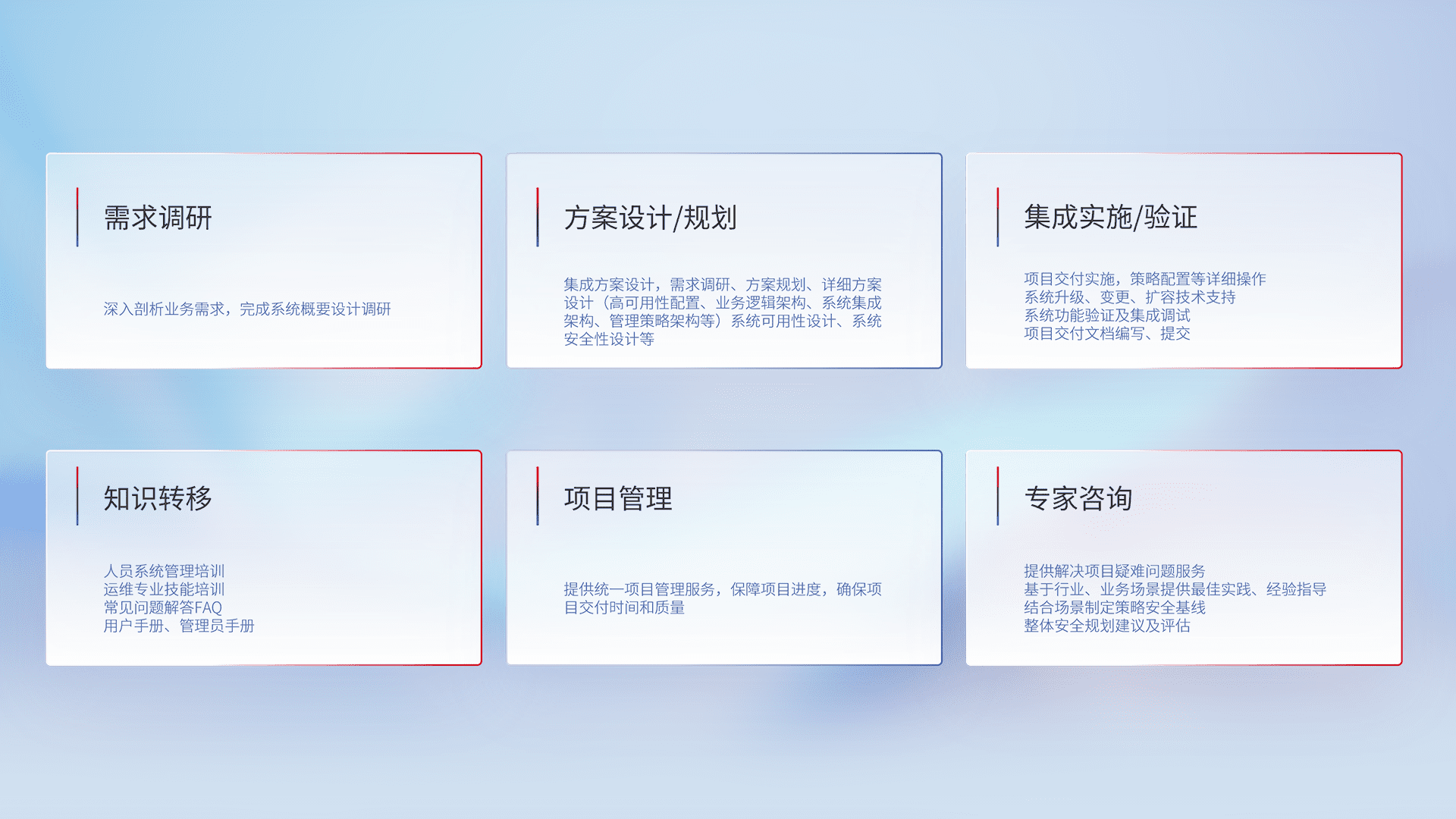 针对客户行业特性,,,,将宏观的安全战略和需求,,通过专业的交付服务,,,实现项目落地,,,为客户提供标准规范的集成交付服务。。。。
